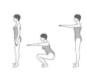 即下蹲锻炼。两脚叉开与肩同宽,双手平举,缓慢深蹲,脚尖着地,脚跟抬起。下蹲要到位,初练下蹲可扶墙等物半蹲,逐渐增加下蹲次数,逐渐做到深蹲。每日做两次,每次下蹲36次。